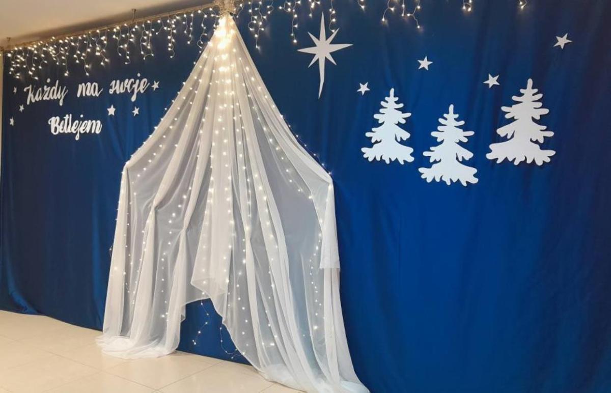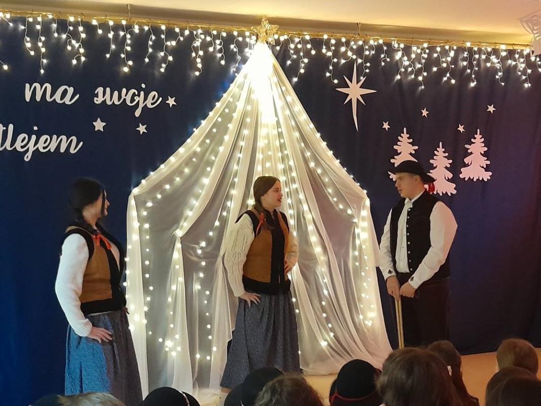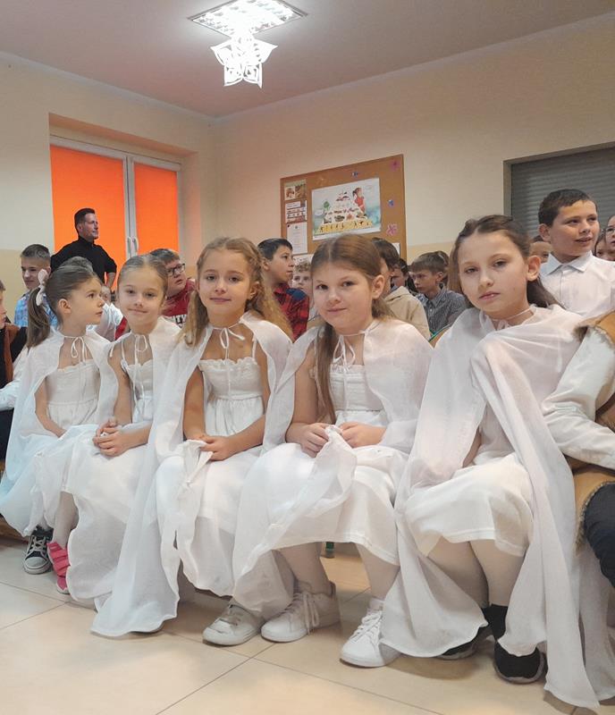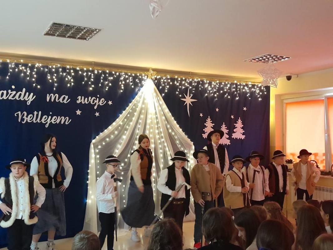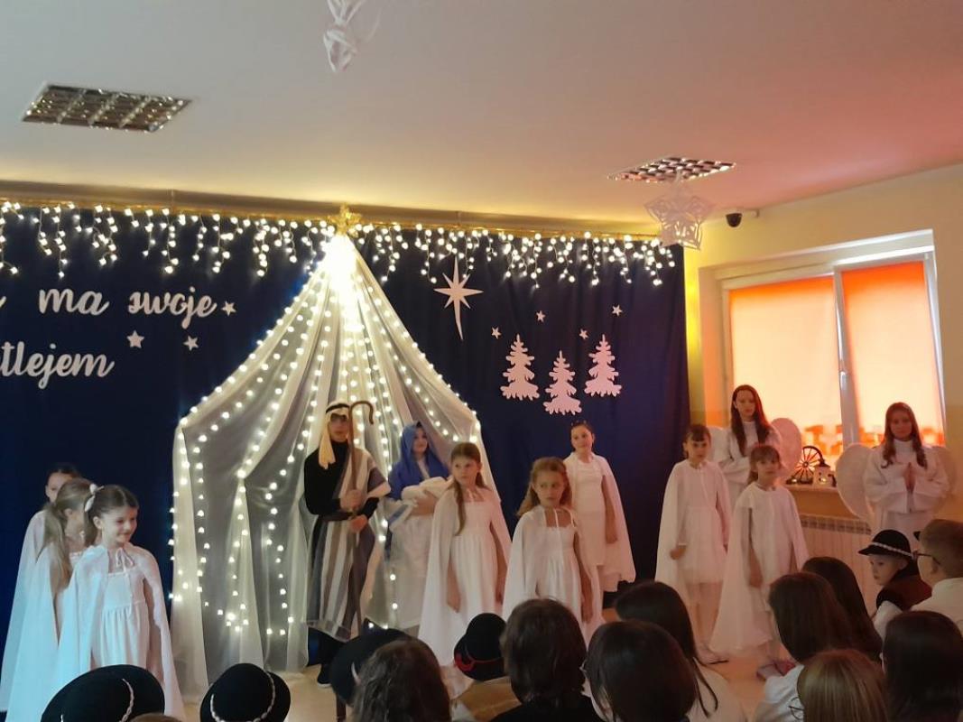 Świąteczne Jasełka. W dniu 17.12.2025 r. uczniowie naszej szkoły przedstawili Świąteczne Jasełka. Następnie uczniowie udali się do klas aby uczestniczyć w klasowych wigiliach